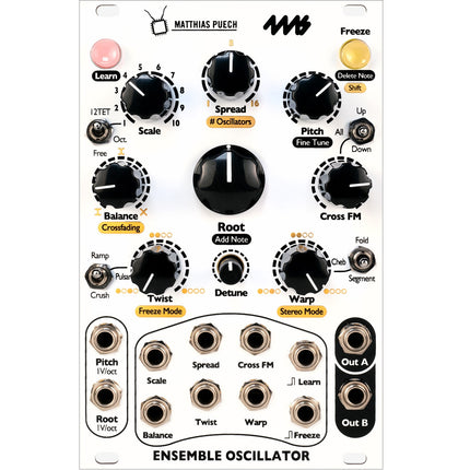 The Ensemble Oscillator is a unified polyphonic voice of sixteen complex oscillators combining additive, FM, phase-distortion and wavefolding synthesis techniques in new unorthodox ways. By quantizing the oscillators to scales or series of harmonics, the Ensemble Oscillator allows you to explore the sonic boundary between musical chords and rich evolving textures. Easily create a wide variety of sounds ranging from aggregates of pure sine waves to pulsar synthesis or pristine harmonic tones and lush wide chords to rich dirty drones and rumbling glitches. Custom scales can quickly be "learned" and saved using a CV keyboard or by manually entering notes with the controls.