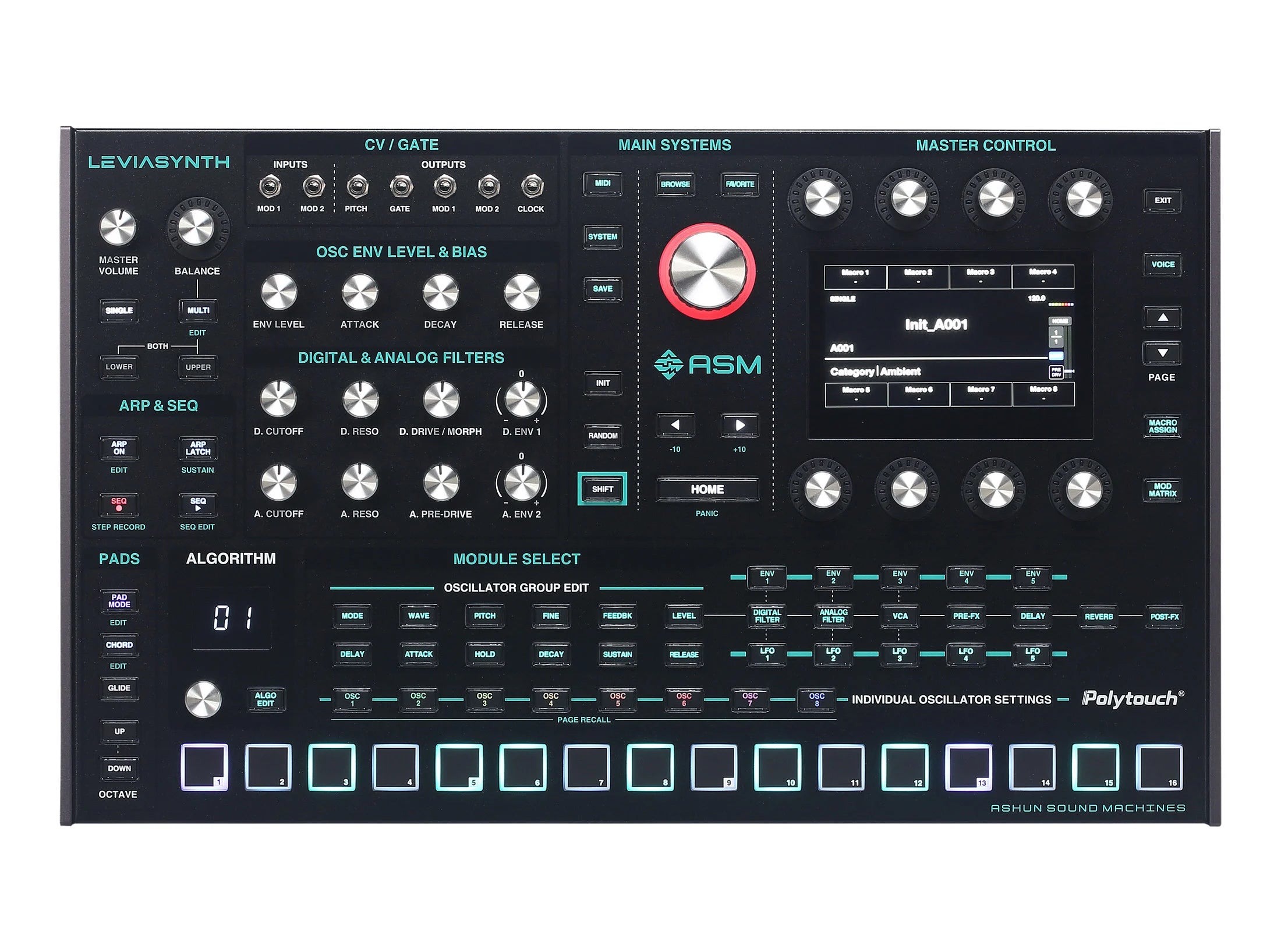 - 16-voice polyphony with 8 oscillators per-voice