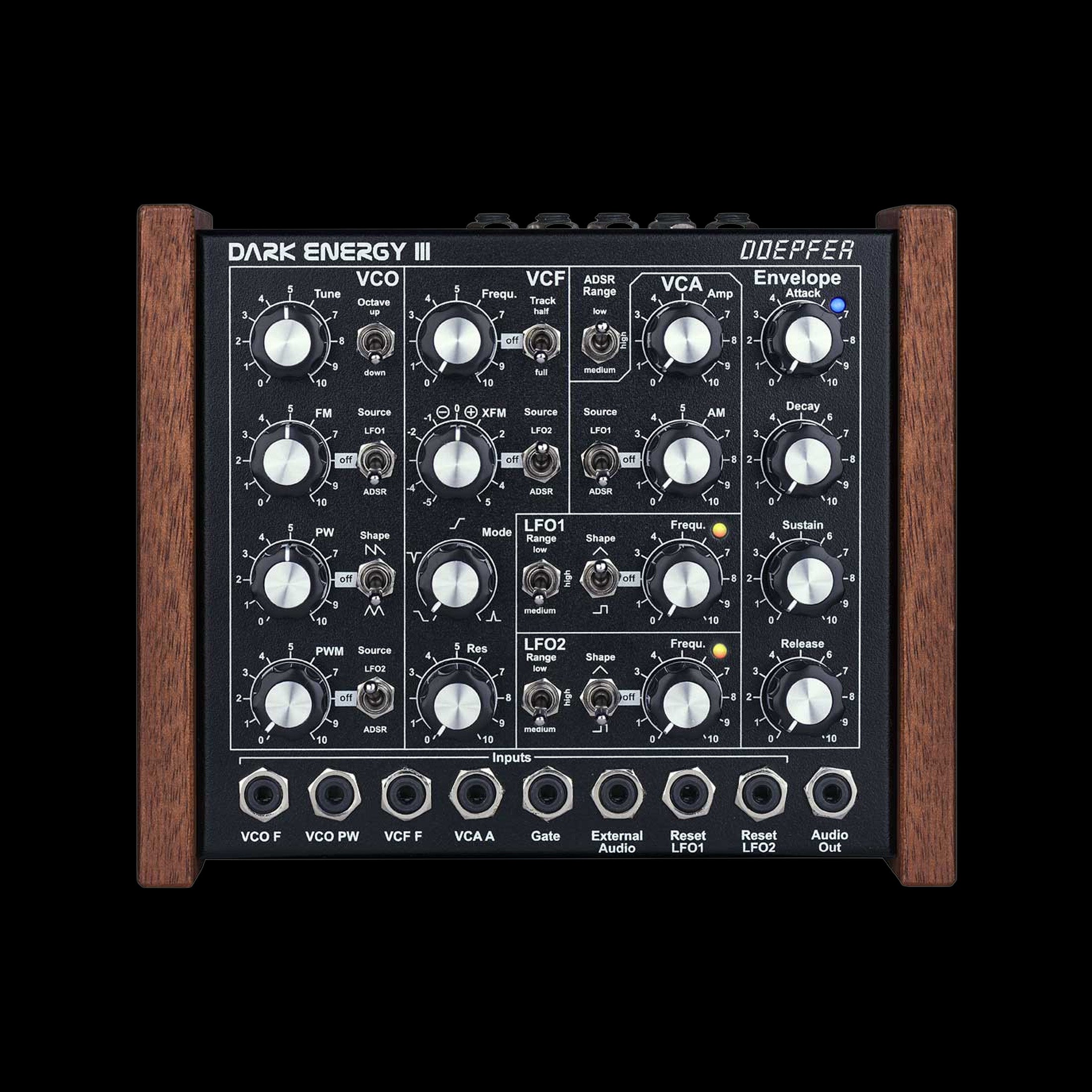 Doepfer’s Dark Energy III is a monophonic synthesizer equipped with USB and MIDI capability. Its sound generators and modulators feature entirely analog signal paths, while the USB/MIDI portion makes use of digital components. It features the same malevolent attitude as its previous incarnations and is built into a sleek black metal case complete with wooden side panels.