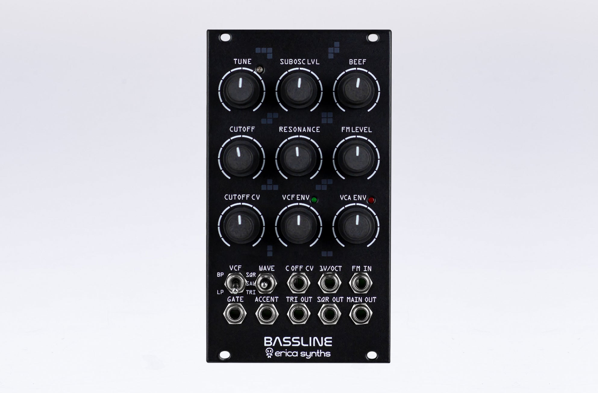 Erica Synths Bassline is fully analogue synth voice module for ultimate basslines and leads. It features AS3340 VCO with three waveforms, a filter inspired by Erica Synths Acidbox and unique features - transistor based suboscillator and two BBD lines that emulate VCO detune creating a sound of massive polysynth from one oscillator. Accent provides more expression to the bassline, by adding volume and opening the VCF slightly.