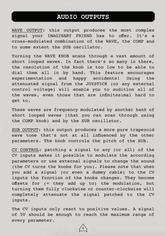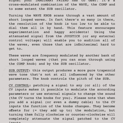 Product formError Instruments Error Instruments - Imaginary Friend imaginary Friend is an experimental full modular complex synthesizer. It can be rhythmic and droning aggressive or minimalistic and everything... Read more Read more $465.00 Add to cart This item is a recurring or deferred purchase. By continuing, I agree to the cancellation policy and authorize you to charge my payment method at the prices, frequency and dates listed on this page until my order is fulfilled or I cancel, if permitted. Share with your friends Share WhatsApp Deel Tweet Pin it Messenger Email