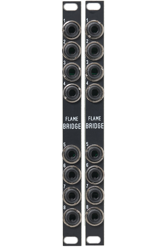 BRIDGE consists of two 2HP jack modules, each with eight mono jacks, passively connected via an 80cm ribbon cable. This creates up to eight direct connections between distant rack locations—a simple, elegant way to avoid long patch cables and reduce cable clutter.
