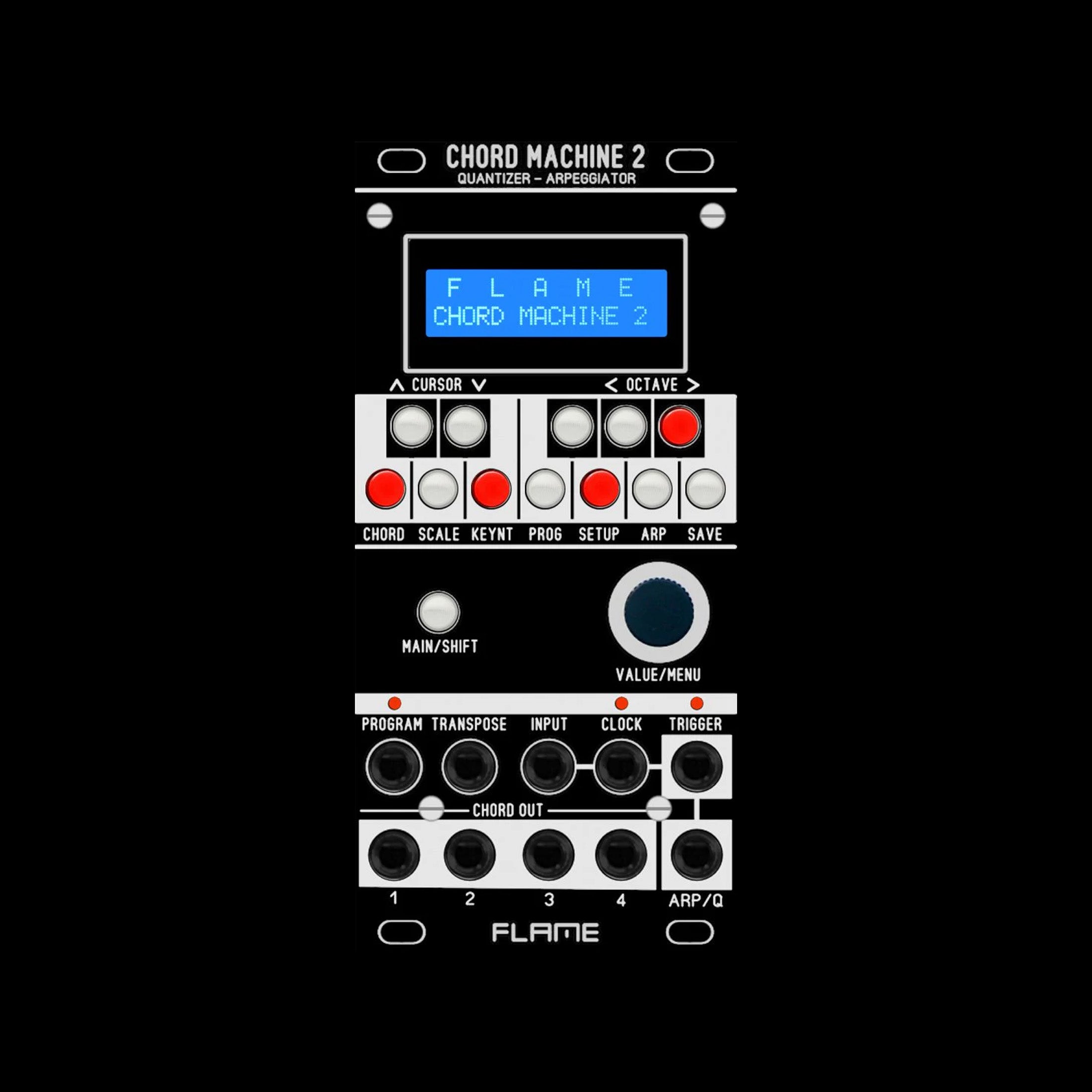 Flame’s Chord Machine 2 comes equipped with a chord generator, an arpeggiator and a quantizer. The module generates up to five voices based on one incoming CV signal. The voices can be spread over a range of eight octaves. 42 presets plus 16 user chords with up to four voices are available for musical experiments. Additionally, it is possible to choose between first, second and third inversion. All in all, musicians get access to 232 chords, which are playable within 54 preset and 15 user scales. Transpositions can be done via a CV input.