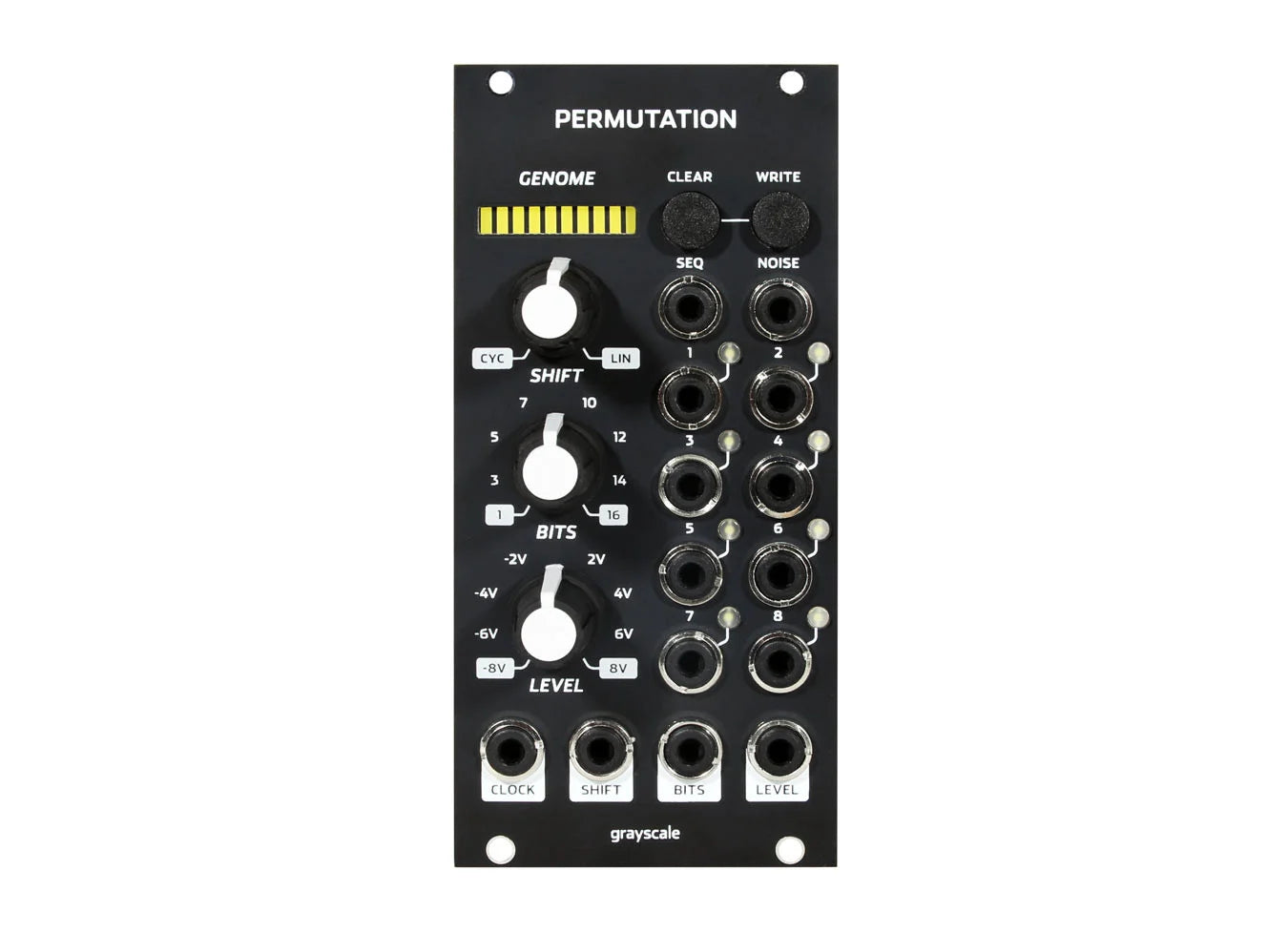 Grayscale's Permutation 12HP is a next-generation derivative of the nefarious Turing Machine. A random sequencer based on a shift register, the Permutation offers looping and non-looping random voltages, sequence generation, gate sequencing, and more. Ideal for generative music, glitchy sound generation, and sequencing duties of all sorts, the Permutation is a powerful addition to a Eurorack setup of any size.