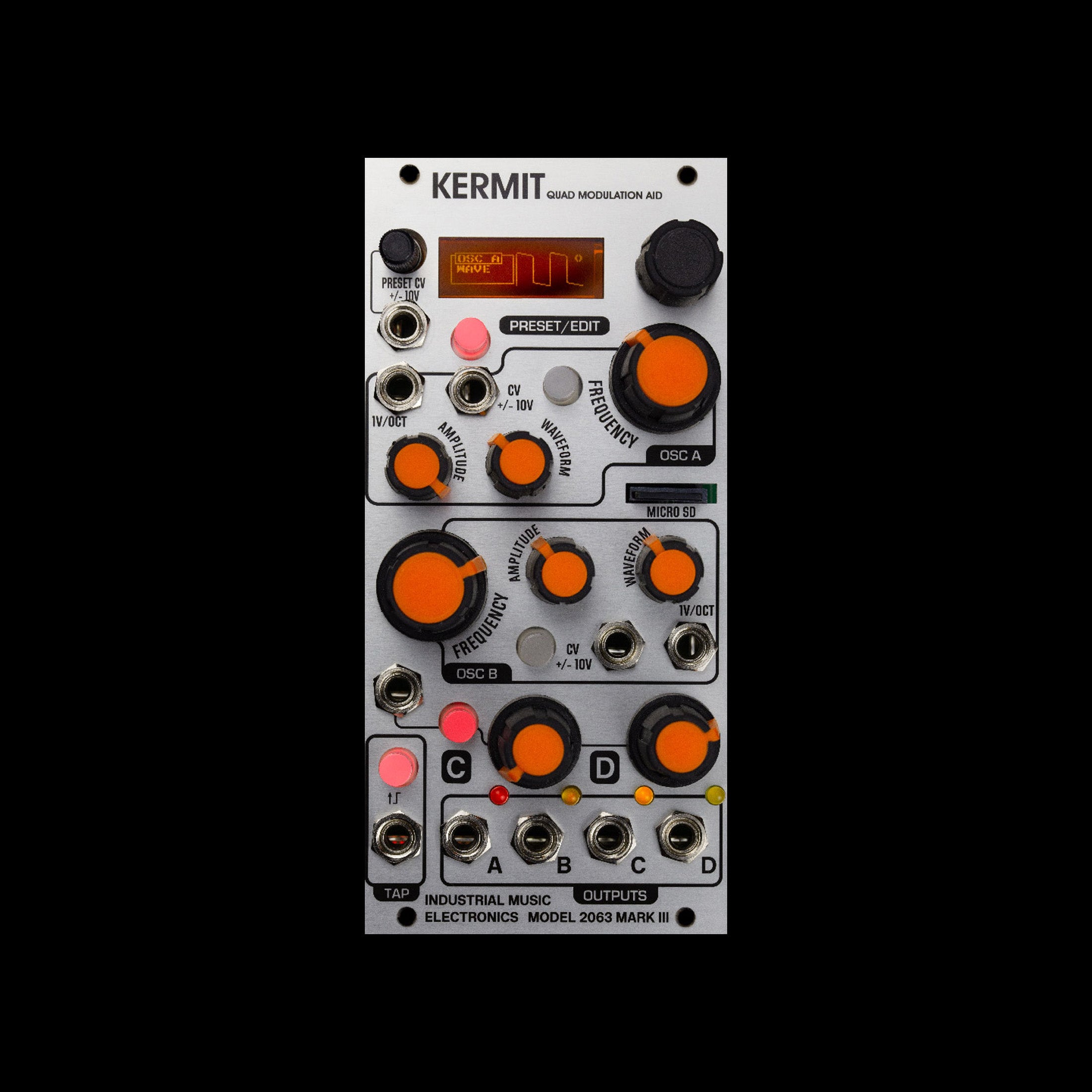 kermit has a microsd card slot for loading custom waveforms, like its big brother piston honda. the sd card accepts one .wav file in waveedit format (free software editor) containing 64 waveforms, also compatible with several other eurorack modules. when loaded into kermit, the waveforms are organized into 8 banks of 8 waveforms each. each oscillator can select any of the 8 banks, and the 8 constituent waves can be smoothly morphed from one to another.