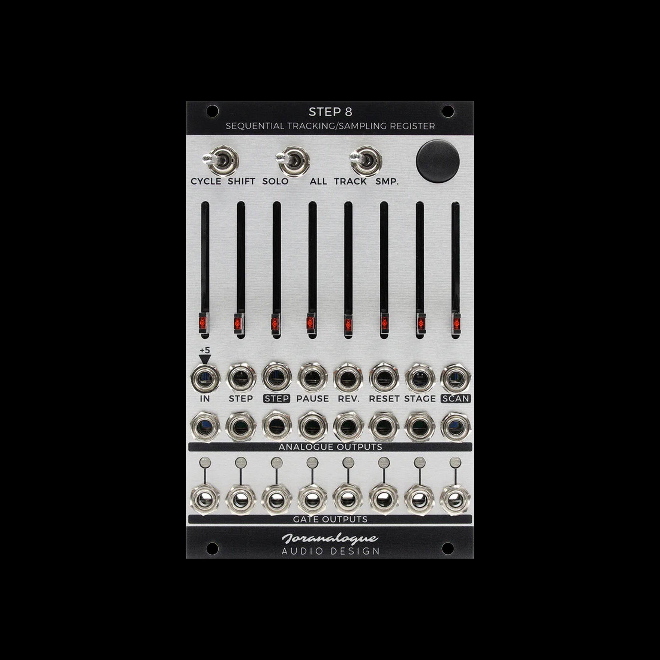 At its heart lies an analogue 1-to-8 signal switch feeding an octet of high-stability track/sample-and-hold stages. Each of these has its own analogue output with an attenuation slider, in addition to a gate output. LEDs visualise the status of each stage in real time. The switch can be controlled sequentially using the built-in 8-step counter, or addressed directly by an analogue control voltage (CV).
