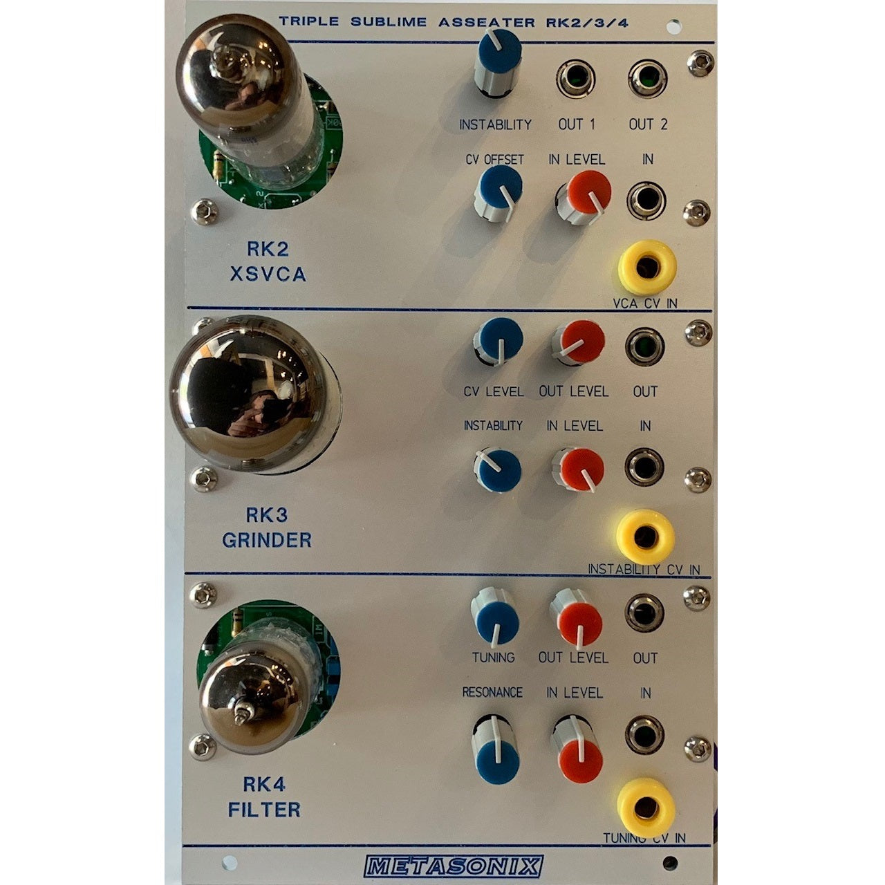 It's very difficult to explain the RK3 in terms of "conventional" solid state electronic music equipment. It uses the tube in a way never seen before -- until Metasonix came along. Waveshaping is provided by our special vacuum-tube "pulser" circuit that spits irregular pulses onto the input waveform. The pulses synchronize erratically with the input pitch (if a waveform with sharp transitions is used). Interaction and a strange sort of "resonance" occurs with the input pitch. The effect is very roughly similar to a (very weird) PLL sound effect. Combined with true vacuum-tube circuit distortion and primitive ring modulation, this can provide a vast range of complex, aggressive distortion effects, utterly unique in the world. It will take you years to fully exploit the RK3's range of effects.