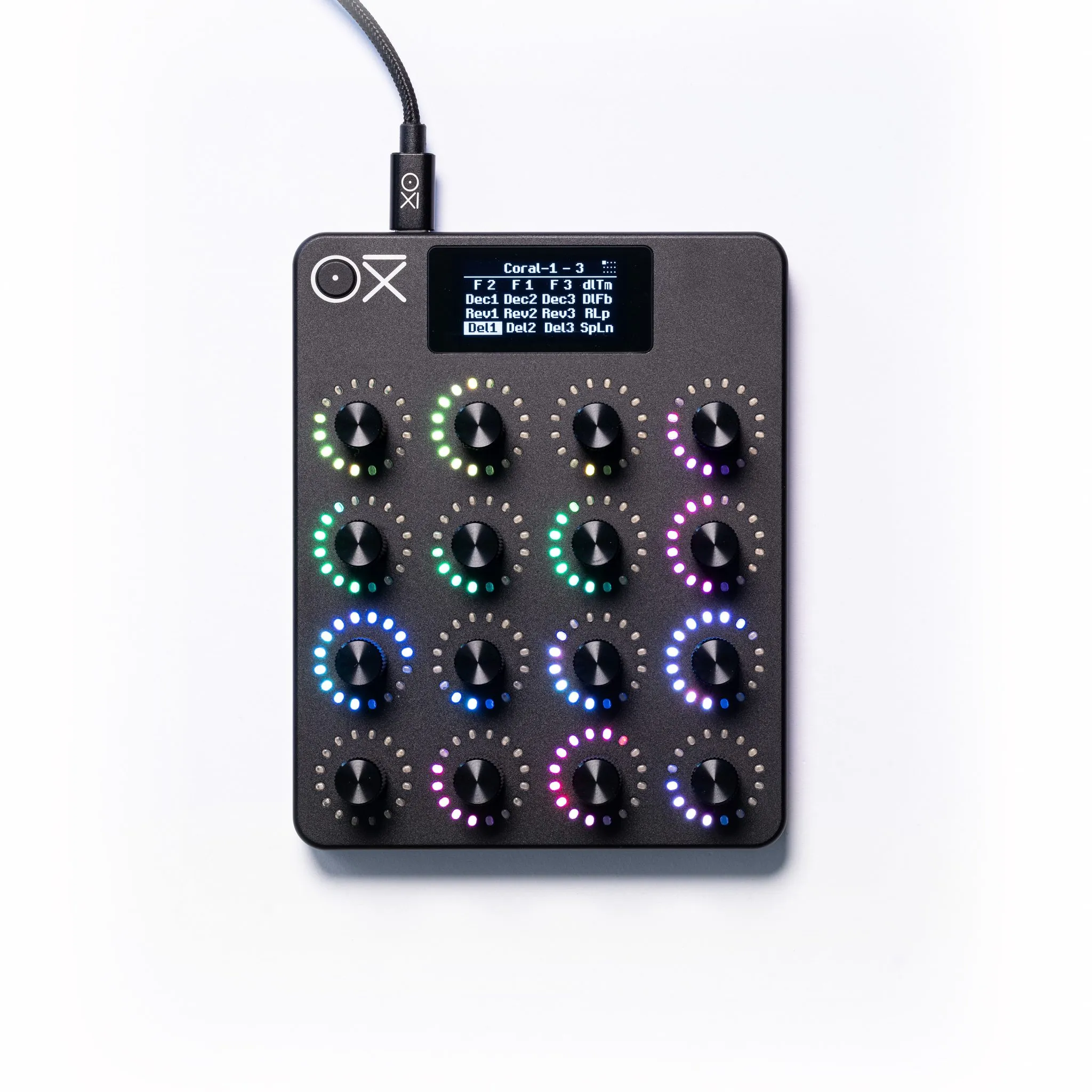 - LED rings around each encoder and OLED screen for clear control visualization