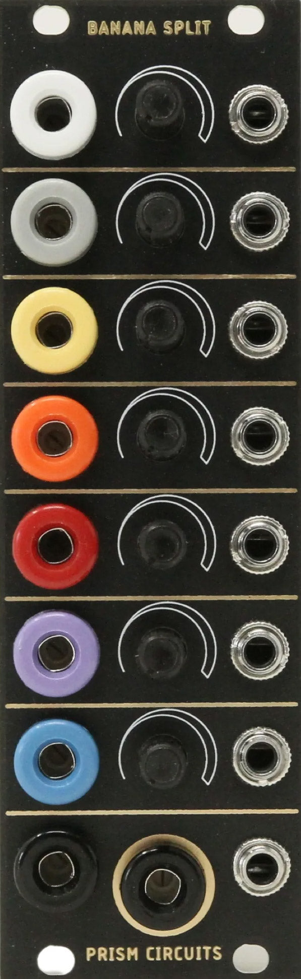 the banana split is a simple Eurorack banana to 3.5mm converter with built in attenuators. this module features 7 banana to 3.5mm converter channels each with an attenuator and a single banana to 3.5mm pass through that is bi-directional. note that the module is passive and does not require power.