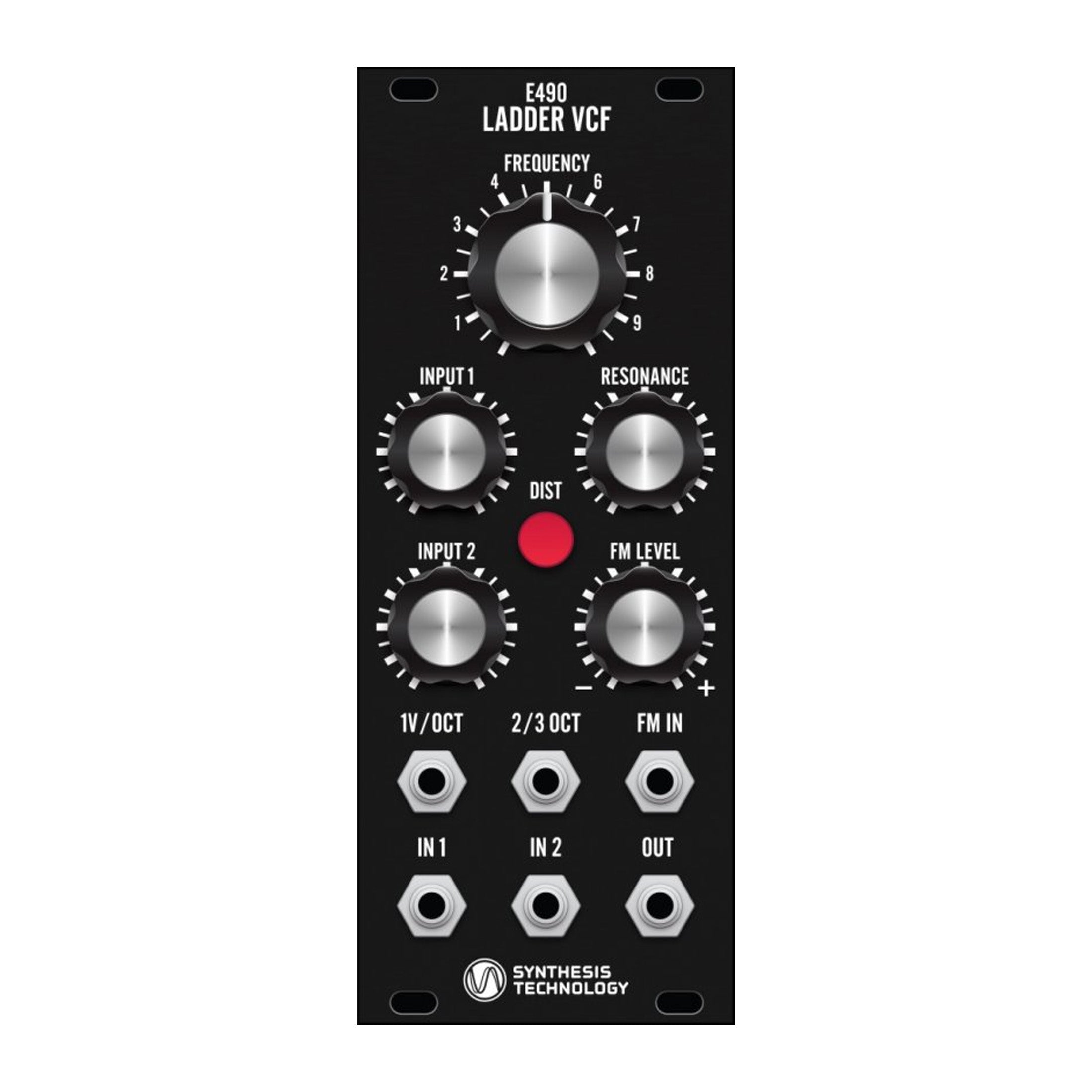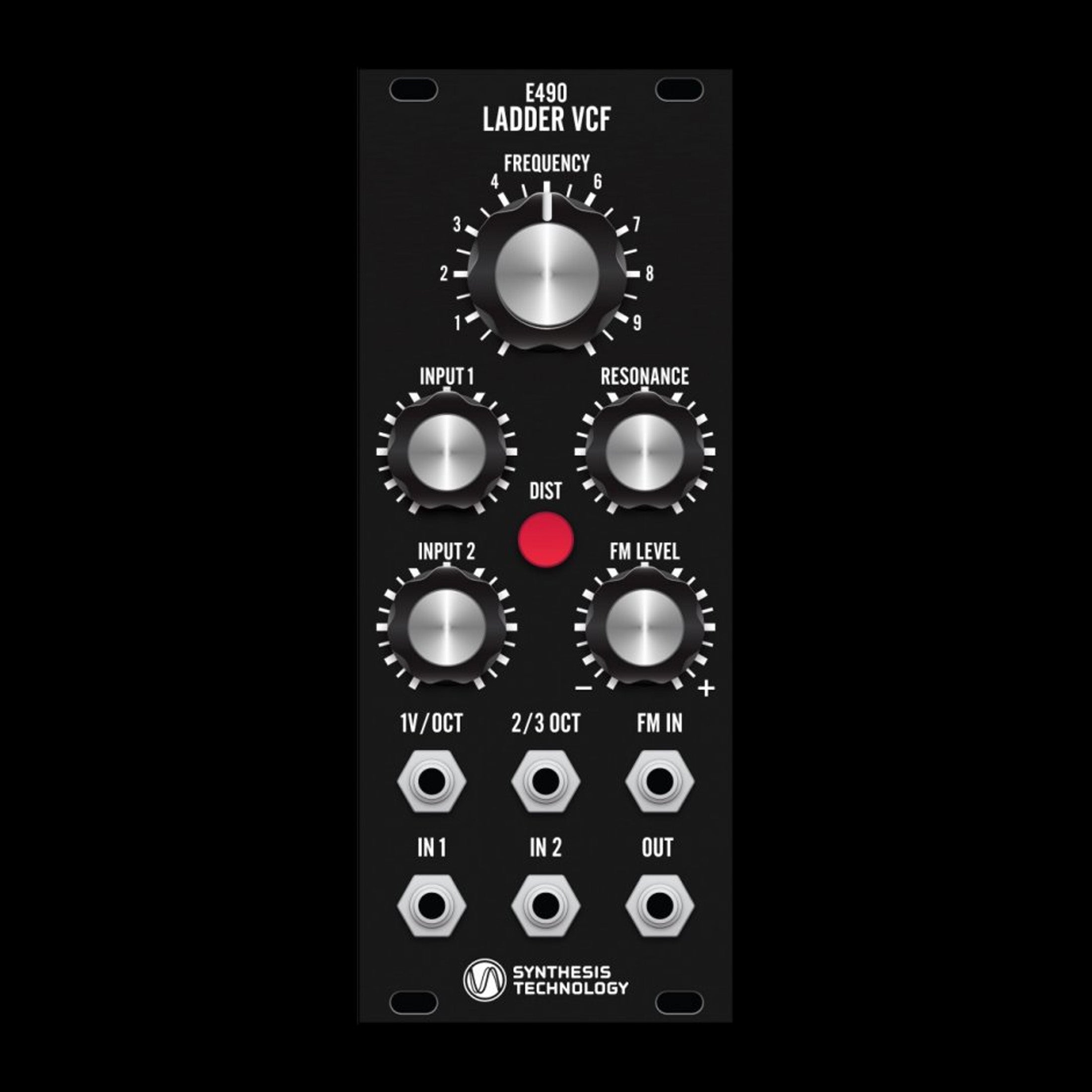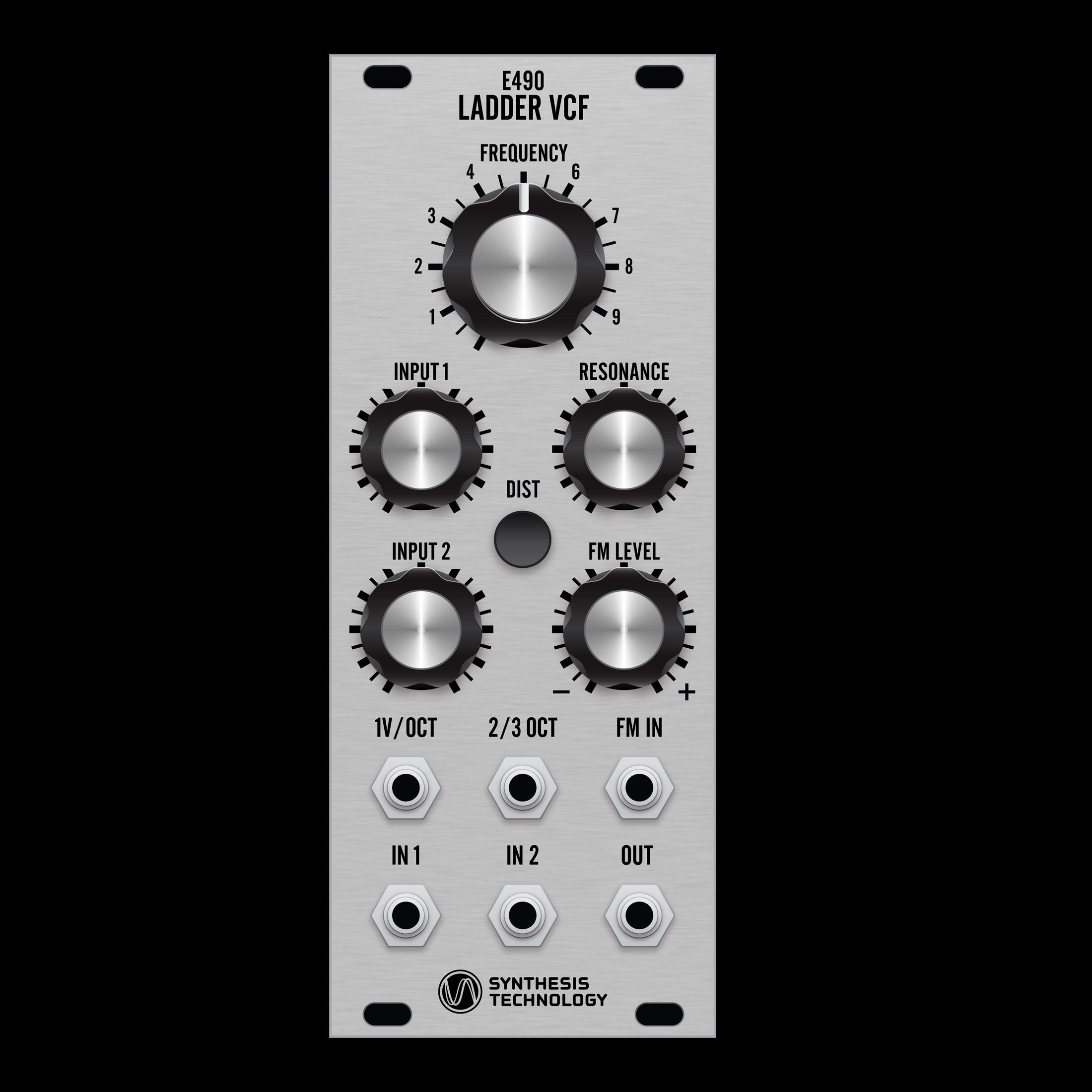The E490 Ladder VCF is a 10HP, Moog 904A 4-pole lowpass filter using modern transistors, but exactly matching the characteristics of the original. Using these new, matched dual and quad transistors allows the E490 to have lower noise and better tracking than the 904A without changing all the ‘quirks' in the sound.
