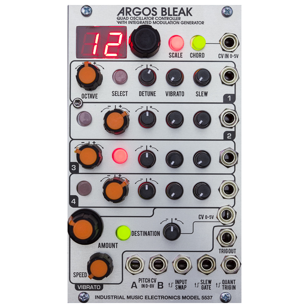 argos bleak is a control voltage processor and oscillator driver with two inputs and four (count 'em, four) outputs. its per-channel octave, detune, vibrato, and slew controls facilitate full performance control of four oscillators at once, with minimum patch cords required. it excels at bringing multiple oscillators from different manufacturers into full cooperation, with the flexibility to quickly switch between multiple performance setups. processed control voltages are quantized to the scale of your choice, with the slew limiting able to be routed pre- or post-quantizer. a common vibrato control distributes the internal modulation signal to any of the outputs. a set of performance gate inputs allow instant modification of the fundamental channel settings (input selection/mixing, slew enable, quantizer track-and-hold), and a quantizer trigger output automatically fires when channel 1 quantizes a new note. each channel may receive its data from either (or a sum or difference) of the cv inputs, so you may run two completely independent cv processing streams, or combine the input data and switch it around using the external gate input.